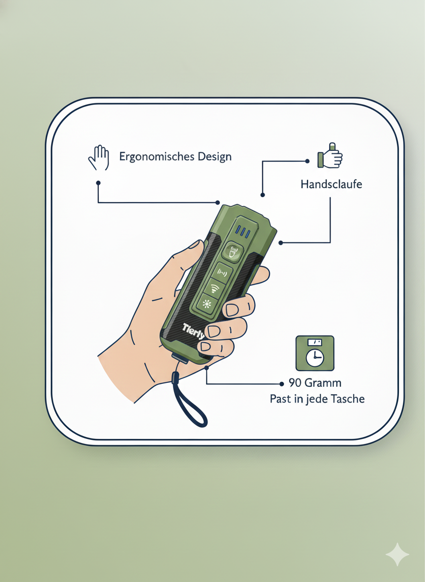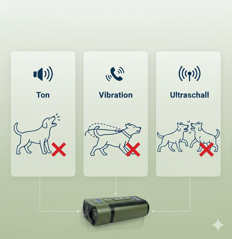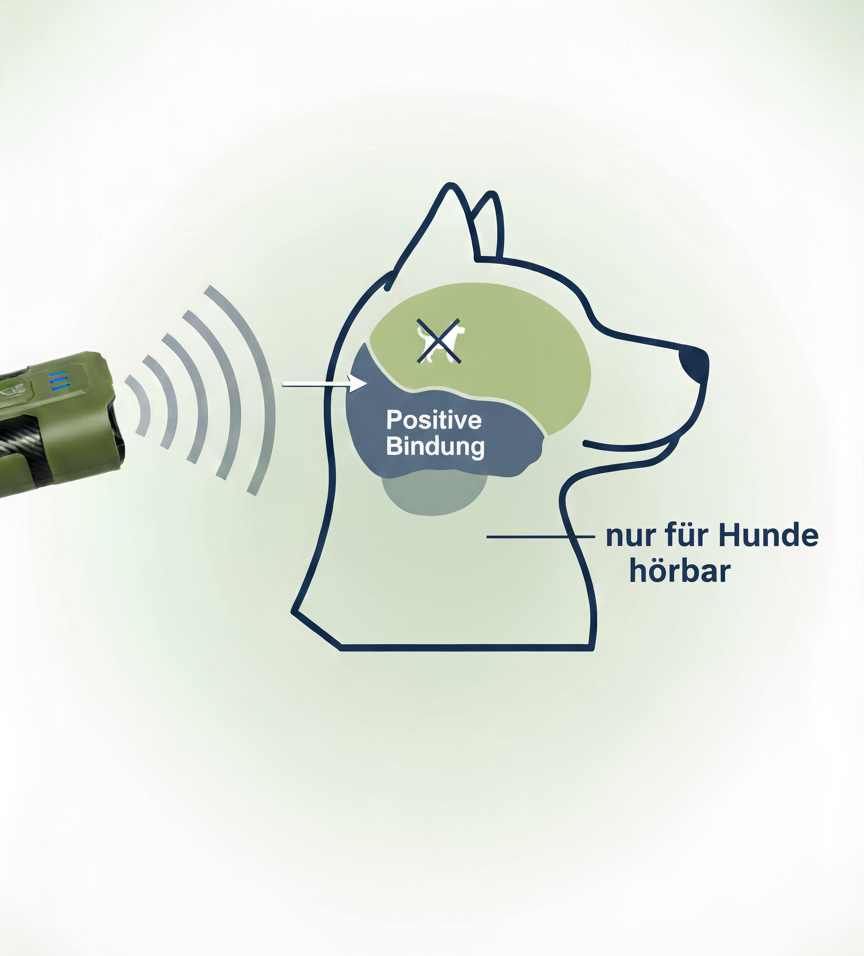 Der Ultraschall-Hundetrainer sendet ein Signal, das nur der Hund hört — es lenkt seine Aufmerksamkeit ab, ohne ihn zu erschrecken.